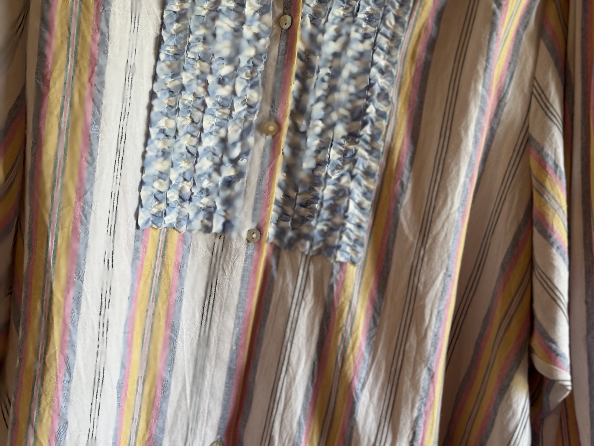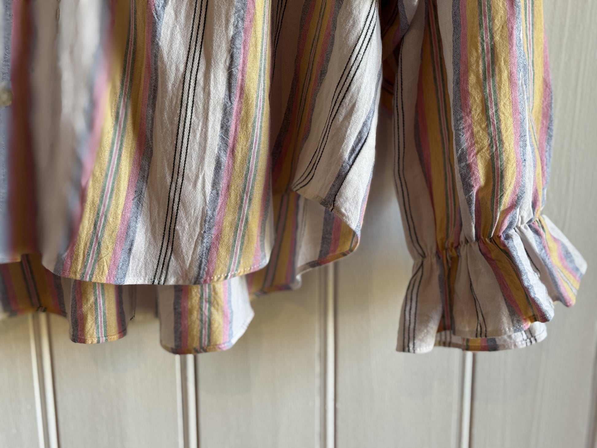 Chemise en coton à rayure jaune, bleu, rose, blanc, avec fantaisie sur le devant, manche resserrée au poignet.