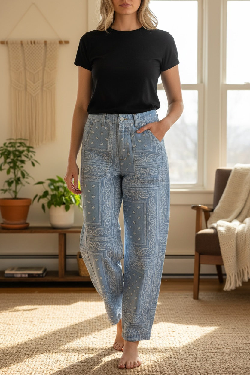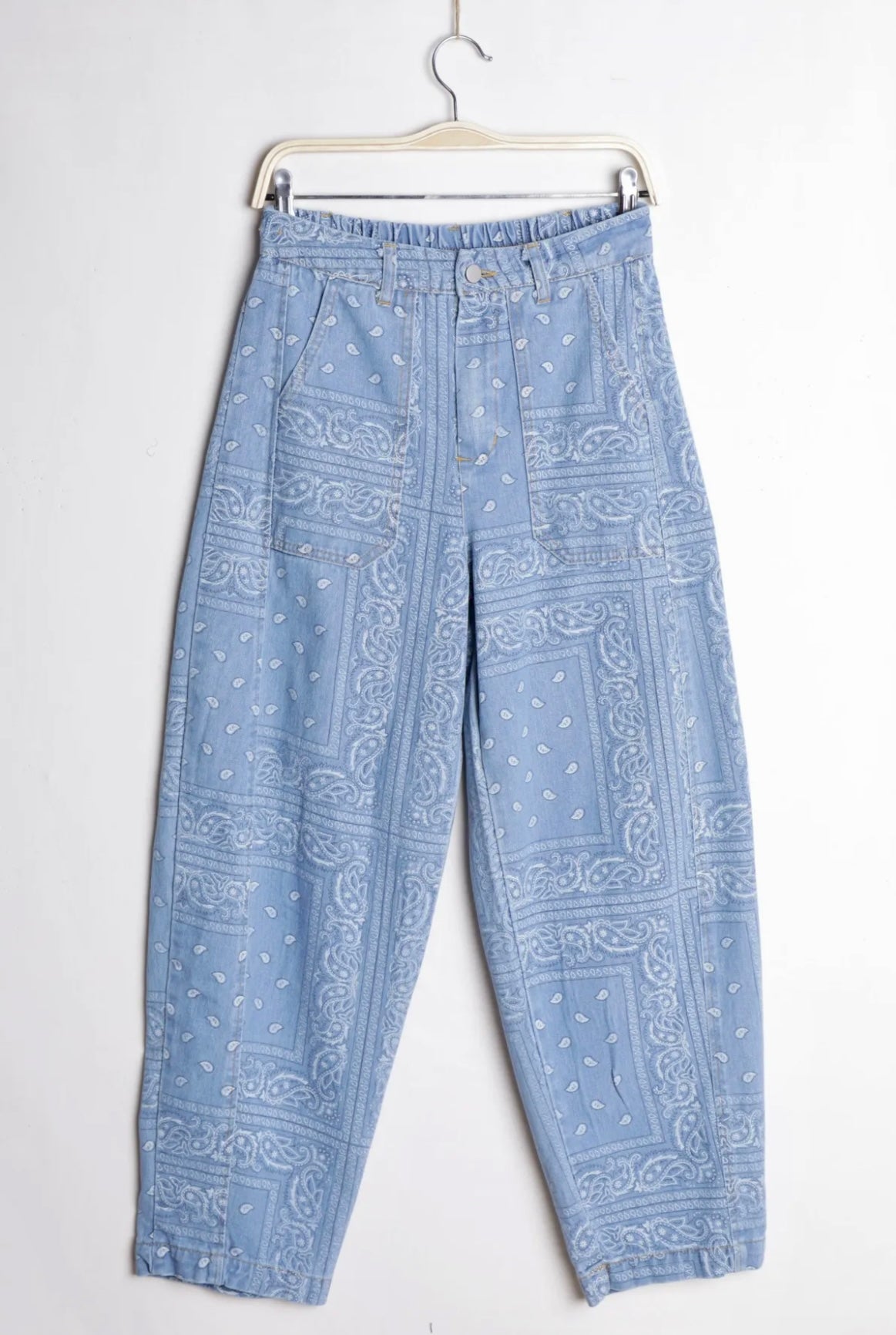 Jean bleu clair imprimé Bandana, taille élastique dans le dos pour plus d'aisance.