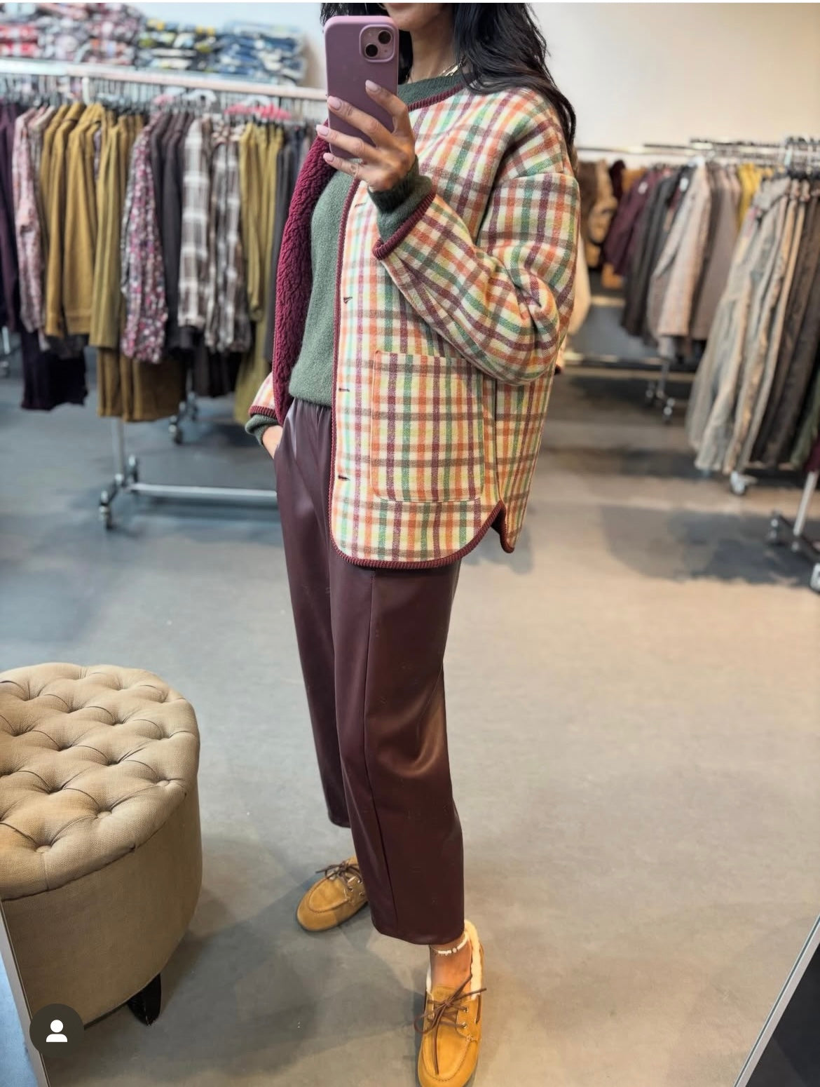 Veste boutonnée à carreaux, doublée polaire bordeaux.