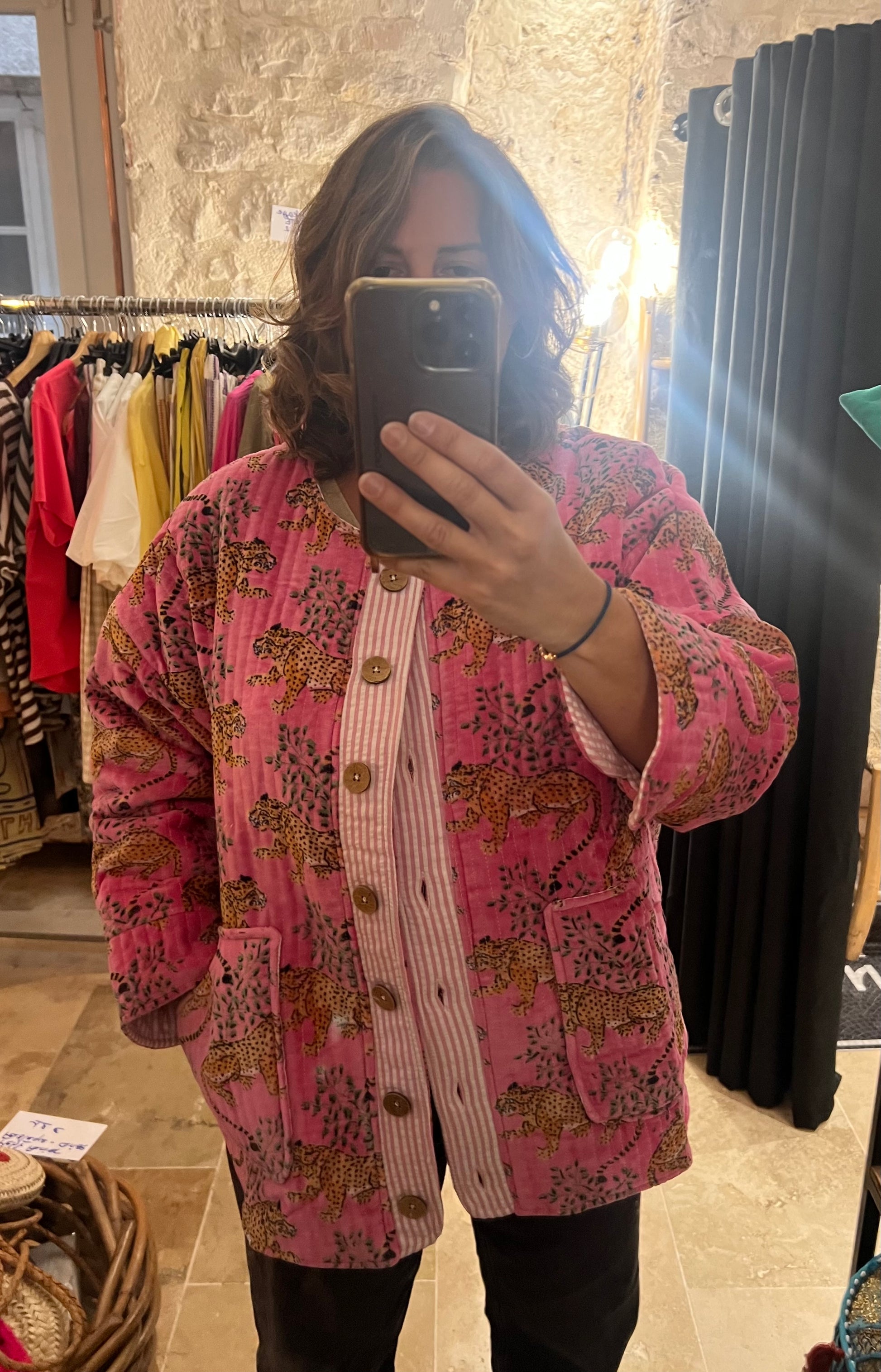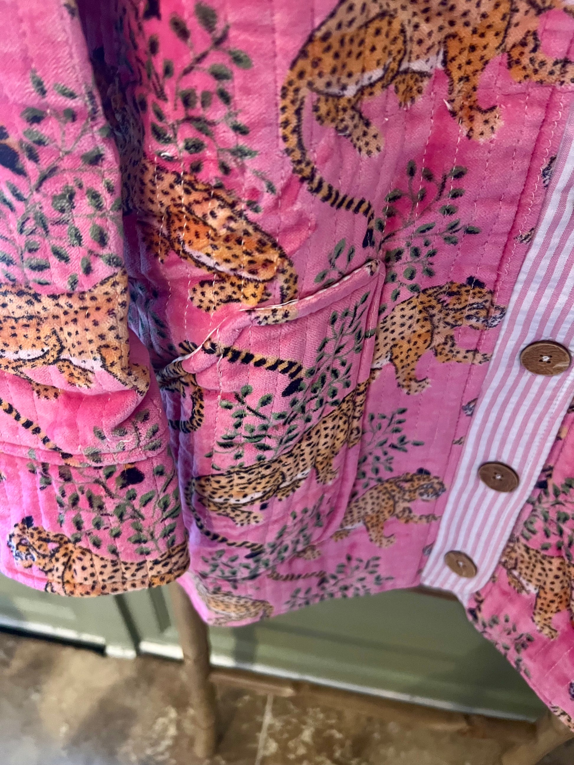 Veste en velours matelassé doublée coton rayé, 100% coton.